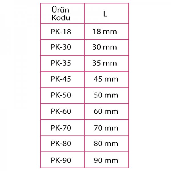 " L " Ölçüleri : 18 - 30 - 35 - 45 - 50 - 60 - 70 - 80 - 90 mm ölçülerinde imal edilmektedir.